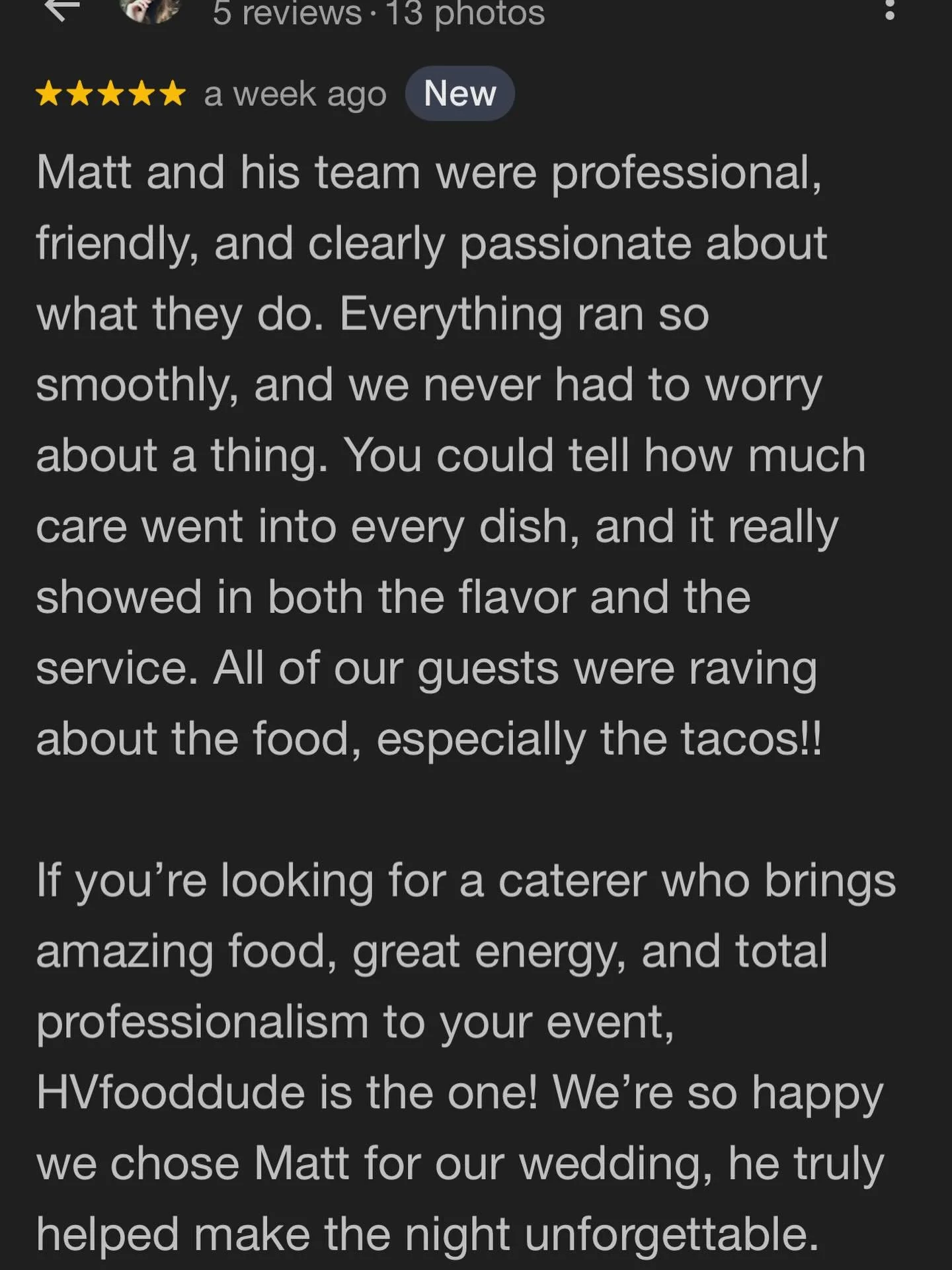 “We hired HV Food Dude to cater our wedding and we are SO GLAD we did. Saying the food was phenomenal would be an understatement…Our guests still have not stopped raving about the food. ” —Taylor